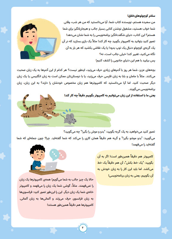 تقویت مهارتهای غیر از برنامهنویسی: این کتاب علاوه بر آموزش برنامهنویسی، به تقویت خلاقیت، حل مسئله، تفکر منطقی و اعتماد به نفس کودکان نیز کمک میکند.